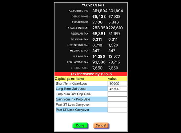 Overall: This is a great tax app. Underneath its simple result display and a nice pie chart showing elements of income and tax there seems thorough implementation of income tax computations. All types of taxes are computed automatically if they are applicable based on the data entered. It provides computational details when you tap on any number on the result display. It will show the corresponding IRS form detailing how the tax amount was calculated. Input is simple and straight forward, results are instantaneous and, generously, they have included 3 years of tax computations; current tax year along with the prior and upcoming tax years.